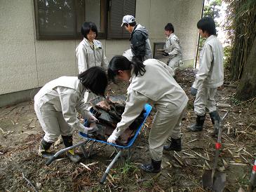 その他にも、担架を使わない搬送方法や止血法などの講義もあり1年生にとってはいよいよ来年から防災コースでの活動の始まりを意識する1日となりました。