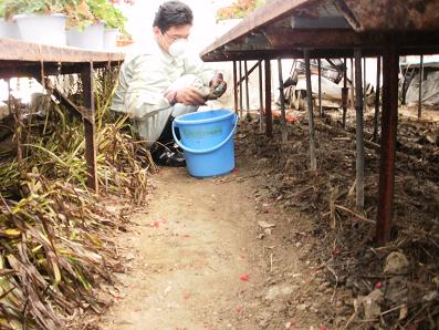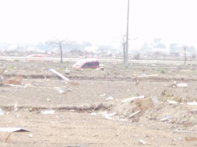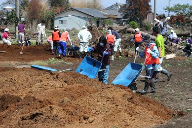 宮城野区で津波被害をうけた農業を営む佐藤さん方で、石油を含む汚泥を取り除く作業を他県のボランティアと一緒に手伝いました。ビニールハウス内外の泥を丁寧にスコップで取り除き集積場に捨てる作業です。道路挟んだ水田では、いつ復旧できるか判らないほど多くのゴミや車などが流されていて手がつけられない状態で、TVなどで見る光景を現実に目すると、何とも言いようのない感情がわき上がってきました。