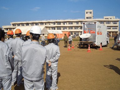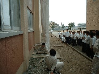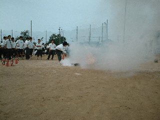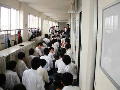 生徒は揺れがおさまるまで暫く待ち、放送の指示に従いグラウンドへ集合した。人員の確認が終了したあと、3年生は消火器訓練、