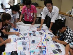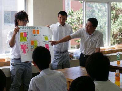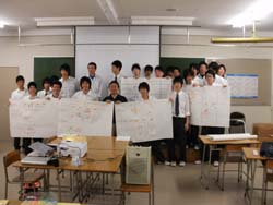 ■小村准教授はコンピュータを駆使し、映像と講義を一体化した講義を実践した。 ■6つに分けた班ごとに、検討した課題を大洋紙に整理するワークショップ