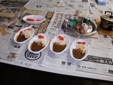■空き缶にサラダ油を注いで燃料とし、ご飯を炊きレトルトカレーを食べました。 ■剣道場で模擬被災体験