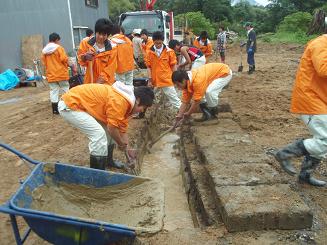 泥出し作業をしました。雨が降りだし、つらい作業となりました。 夕方から降り出した雨が強くなり、テント泊からキャンプ場の古民 家に宿泊しました。
