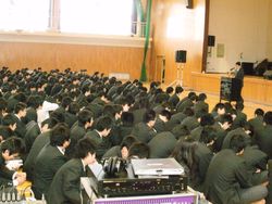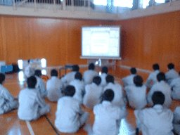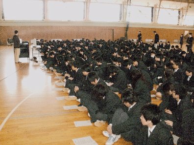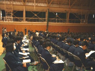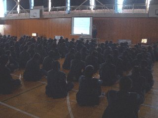 ■体育館での点呼 ■全校生徒 ■講演はホワイトボードでわかりやすい説明をしていただいた。