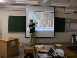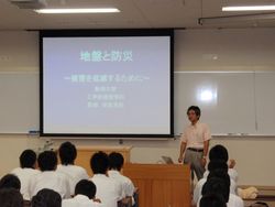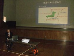 工学部建設学科の保坂吉則助教授より「地盤と建築物の耐震性について」と題した講義をしていただいき、新潟地震・中越地震・中越沖地震での住宅被害の説明を受けた後、県内の各地域の地盤強度や住宅の耐震性についての話を聞きました。