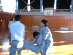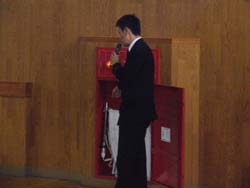 今年は、天候が雨となり避難場所がグラウンドから体育館に変更された。地震火災を想定し、スピーカから地震音がしばらく流れる。生徒は揺れがおさまるまで暫く待ち、放送の指示に従い体育館へ集合する。人員の確認が終了したあと、柏崎消防所より講評と指導をしていただいた。