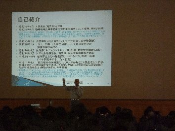 ■講義が始まりました。東海、東南海、南海地震が「約100年ごとに発生する周期に若い世代が生きていることの意味を知ってほしい」と話されました。