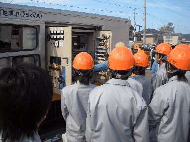 柏崎市の総合防災訓練が高柳中学校を会場に実施されました。バイクによる物資の搬送訓練、屋上からヘリコプターによる救助訓練などを見学しました。防災エンジアコース2年生18名は東北電力より低圧非常用電源車についての説明、NTTからは衛星を使った非常用移動通信車からインターネットへの接続等、東日本大震災において実際に活動した様子などを学習しました。その他にも起震車体験、濃霧通過体験や行政の方と連携して初期消火訓練、バケツリレー、倒壊家屋救出救護訓練などを実演しました。