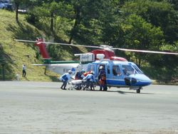 ■西山中学校の体育館への放水訓練 ■ヘリコプターによる重傷者の搬送訓練 ■救助犬による重傷者の発見訓練