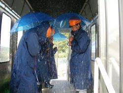 ■起震車での「震度7」を体験 ■降雨車にのって豪雨体験