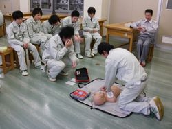 12月24日(金)午後1時より3時間にわたって普通救急講習会を実施しました。受講生は来年度、防災エンジニアコースを選択した21名です。消防署員の方の熱心な指導で、心肺蘇生法である胸部圧迫法とAEDの使い方を中心に講習していただきました。