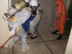 ■濃煙訓練(暗闇から倒れている人を救助) ■ロープ結索法 ■消防機材説明