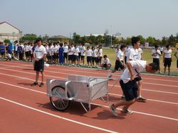 今年度は、防災活動の一環として体育祭の障害物リレーの中に、リヤカーによる土嚢運びを取り入れました。約20kgの土嚢をリヤカーに積んでゴールを目指します。