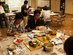 夕食は空き缶、サラダ油を使ったカレー作りです。各班ともおいしくできました。夕食後も防災クロスロードというゲームや避難所における十箇条づくりを体験し、夜遅くまで学習キャンプは続きました。その後、剣道場で就寝になりました。